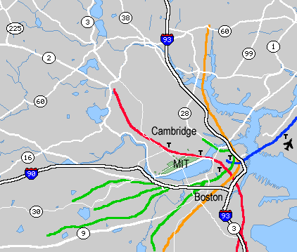 From I-93, take exit 26, and follow the signs to Back Bay along Storrow Drive West, approximately 1.5 miles, to the exit for Route 2A. The exit will be on the left, just before the Harvard Bridge (more appropriately called the Massachusetts Avenue Bridge). The Charles River will be on your right. As you cross the bridge, you will be looking at MIT - the Great Dome and academic facilities are on the right, the dormitories and athletic facilities are on the left.